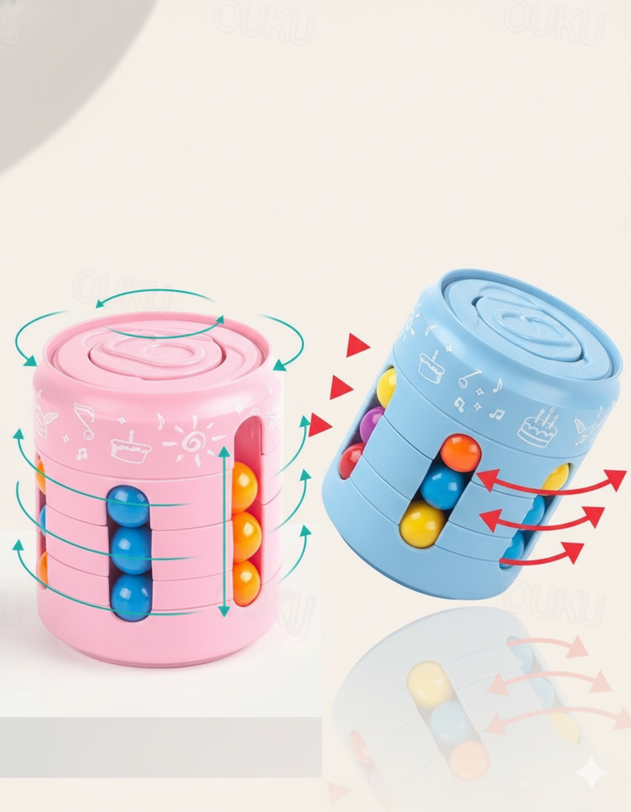 Es un juguete giratorio tipo rompecabezas en 3D donde al girar una capa, las demás se mueven en cadena. Está diseñado para estimular la creatividad, el pensamiento espacial y servir como entretenimiento antiestrés.