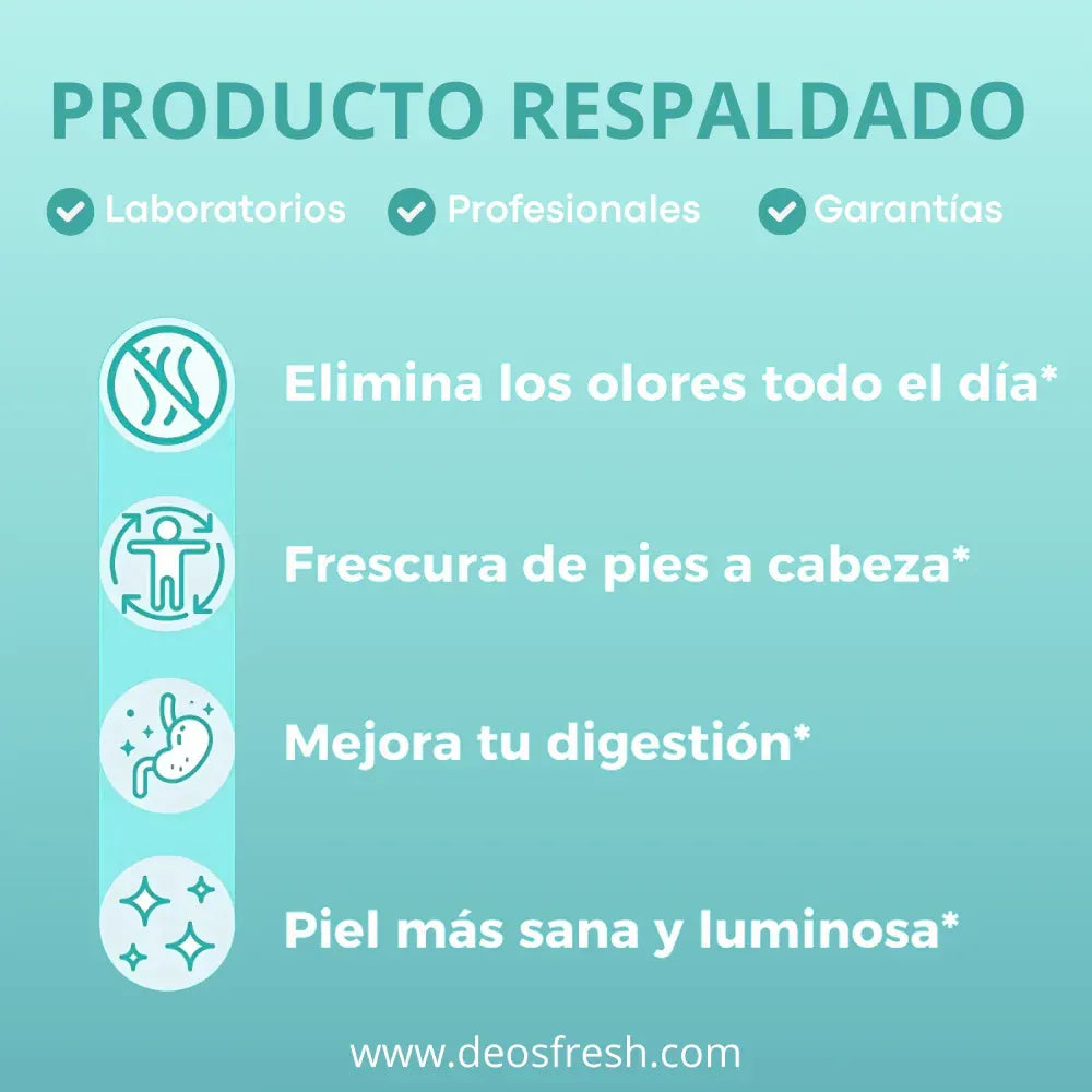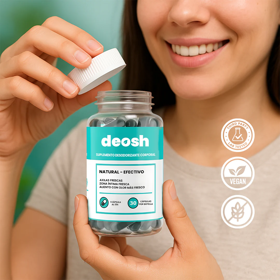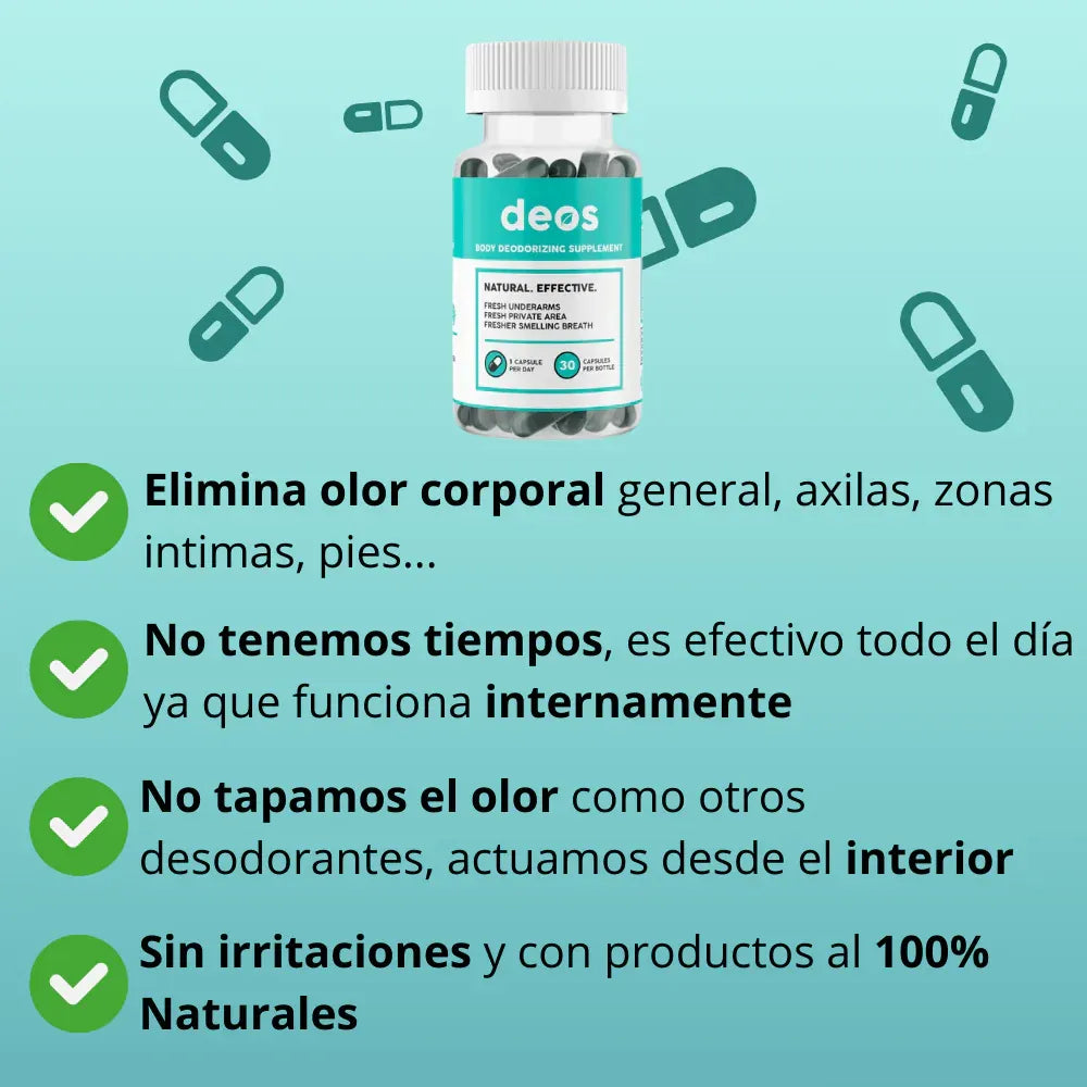 👉 Deos es un desodorante interno en cápsulas elaborado con ingredientes naturales que ayudan a neutralizar los olores corporales desde adentro.