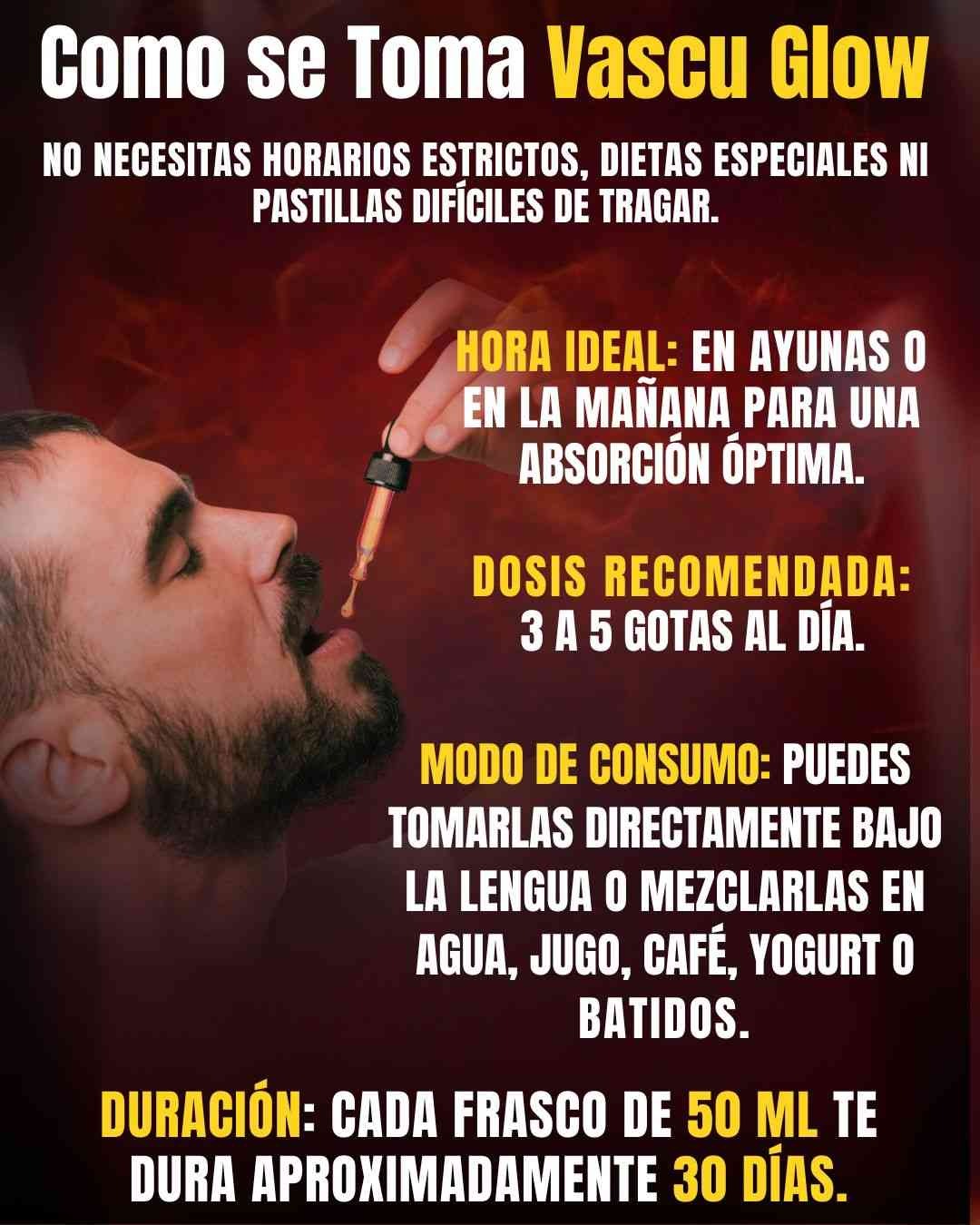 Se recomienda tomar una cápsula de VASCU GLOW al día, preferiblemente con el desayuno o en la mañana, acompañado de un vaso de agua. Gracias a su fórmula avanzada, empieza a actuar desde el día uno, pero los resultados más visibles suelen aparecer tras 4 a 6 semanas de uso constante.
